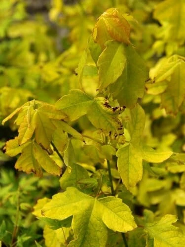 The golden trident maple is quite unique and extremely colorful. By late spring, the leaves turned to bright green. Autumn color typically ranges from orange to red.
