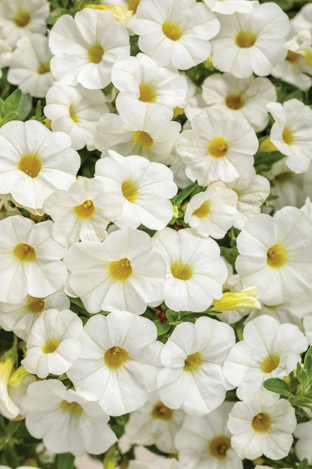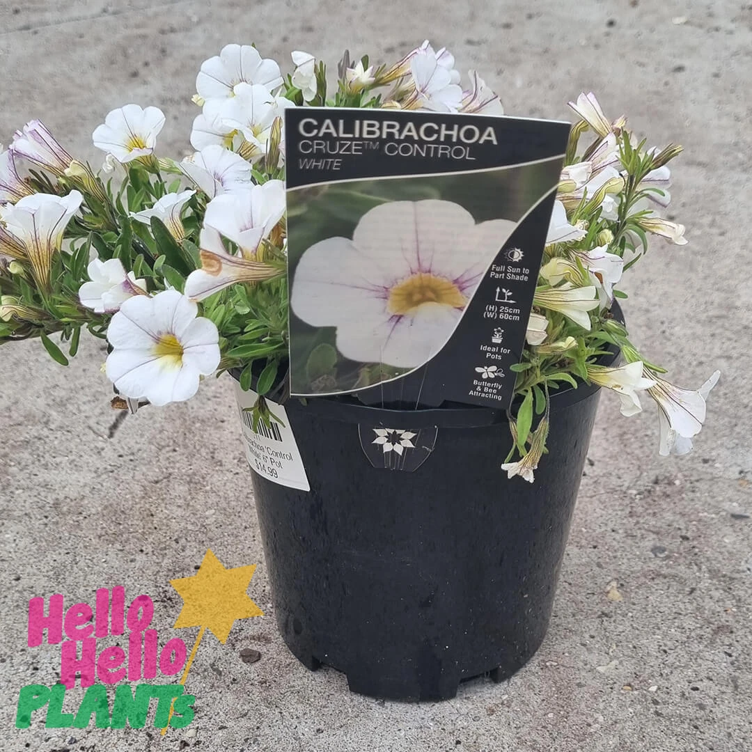 This white variety of cottage styled calibrachoa has a trailing habit maturing to 25cm tall by 50cm wide. Perfect for hanging baskets, pots and containers or even borders and ground covers in your garden. Position in full sun and part shade. Bird and Bee attracting.